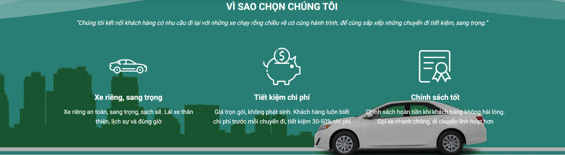 ” Chúng tôi kết nối khách hàng có nhu cầu đi lại với những xe chạy rỗng chiều về (hoặc chiều đi) có cùng hành trình, để cùng sắp xếp những chuyến đi tiết kiệm, sang trọng.” Hotline: 0988.401.188